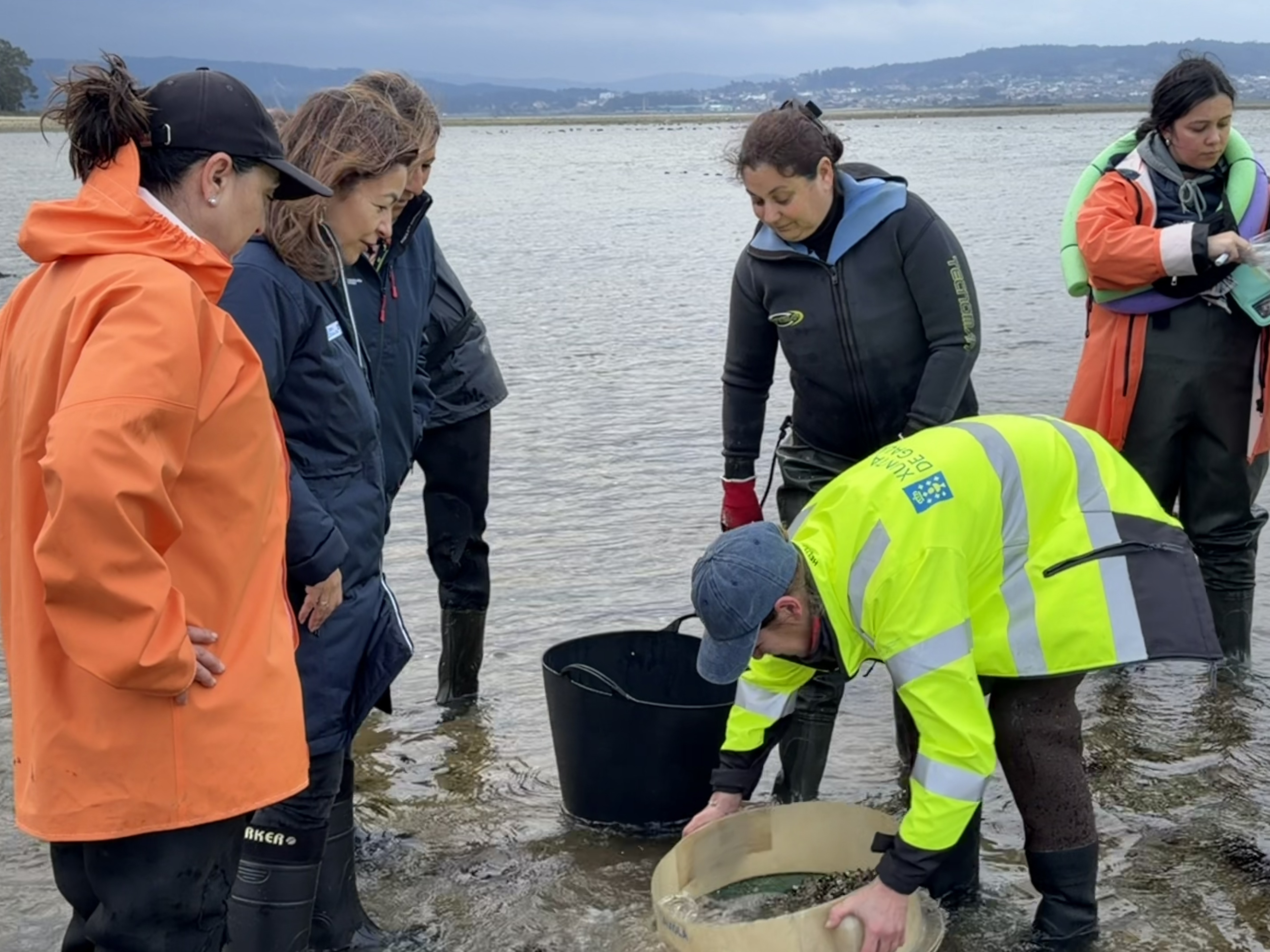 Neste contexto, a directora xeral de Desenvolvemento Pesqueiro, Ángeles V. Suárez, tamén supervisou os traballos de mostraxe que se están a desenvolver no banco marisqueiro de Croa, no ámbito da confraría de Pontedeume. Un labor que se repetiu ao longo desta xornada e nos vindeiros días noutros bancos marisqueiros das provincias da Coruña e Pontevedra, incluíndo zonas das rías de Arousa, Vigo, Pontevedra, Ares, Betanzos, Ferrol e O Burgo.